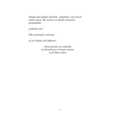 . Jekupé luce frágil, humilde, empática, con sed de tomar amor. Me acerco en donde está para preguntarle: ¿Adónde vas? Ella sonriendo exclama: ¡A los límites del infierno! Ahora pienso en cuidarla, en llevarla por el buen camino a mi dulce selva. 44