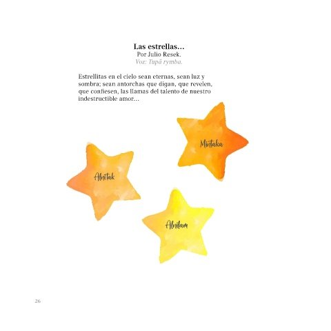 . Las estrellas… Por Julio Resek. Voz: Tupã rymba. Estrellitas en el cielo sean eternas, sean luz y sombra; sean antorchas que digan, que revelen, que confiesen, las llamas del talento de nuestro indestructible amor… Mintaka Alnitak Alnilam 26