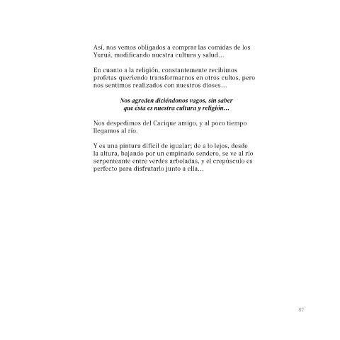 la forma de vida del Mbya, a la del Yuruá. Los Mbya profetas queriendo transformarnos en otros cultos, pero