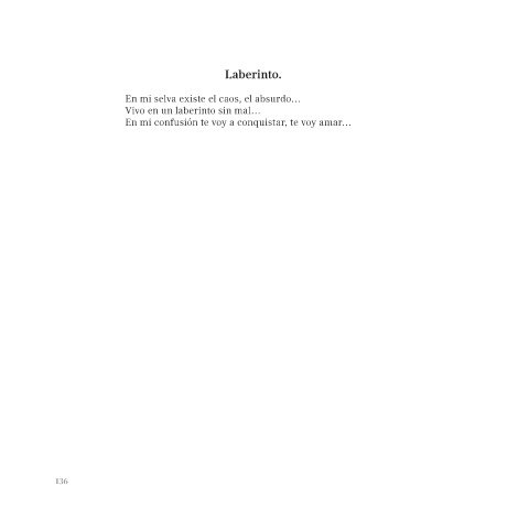 . Laberinto. En mi selva existe el caos, el absurdo… Vivo en un laberinto sin mal… En mi confusión te voy a conquistar, te voy amar… 136