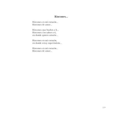 . Rincones... Rincones en mi corazón... Rincones de amor... Rincones que huelen a ti... Rincones con sabor a ti, en donde quiero amarte... Rincones en mi corazón, en donde estoy esperándote... Rincones en mi corazón... Rincones de amor... 229