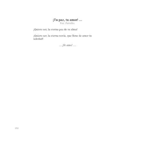 . ¡Tu paz, tu amor! … Voz: Farolito. ¡Quiero ser, la eterna paz de tu alma! ¡Quiero ser, la eterna novia, que llene de amor tu soledad! … ¡Te amo! … 352