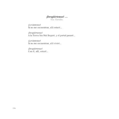 . ¡Despiértense! … Voz: Farolito. ¡Levántense! Si no me encuentran, allí estaré... ¡Despiértense! A la Tierra Sin Mal llegaré, y el portal pasaré... ¡Levántense! Si no me encuentran, allí viviré... ¡Despiértense! Con él, allí, estaré... 356