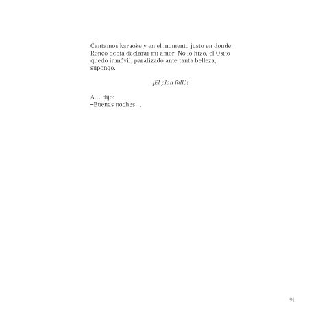 . Cantamos karaoke y en el momento justo en donde Ronco debía declarar mi amor. No lo hizo, el Osito quedo inmóvil, paralizado ante tanta belleza, supongo. ¡El plan falló! A… dijo: –Buenas noches… 91
